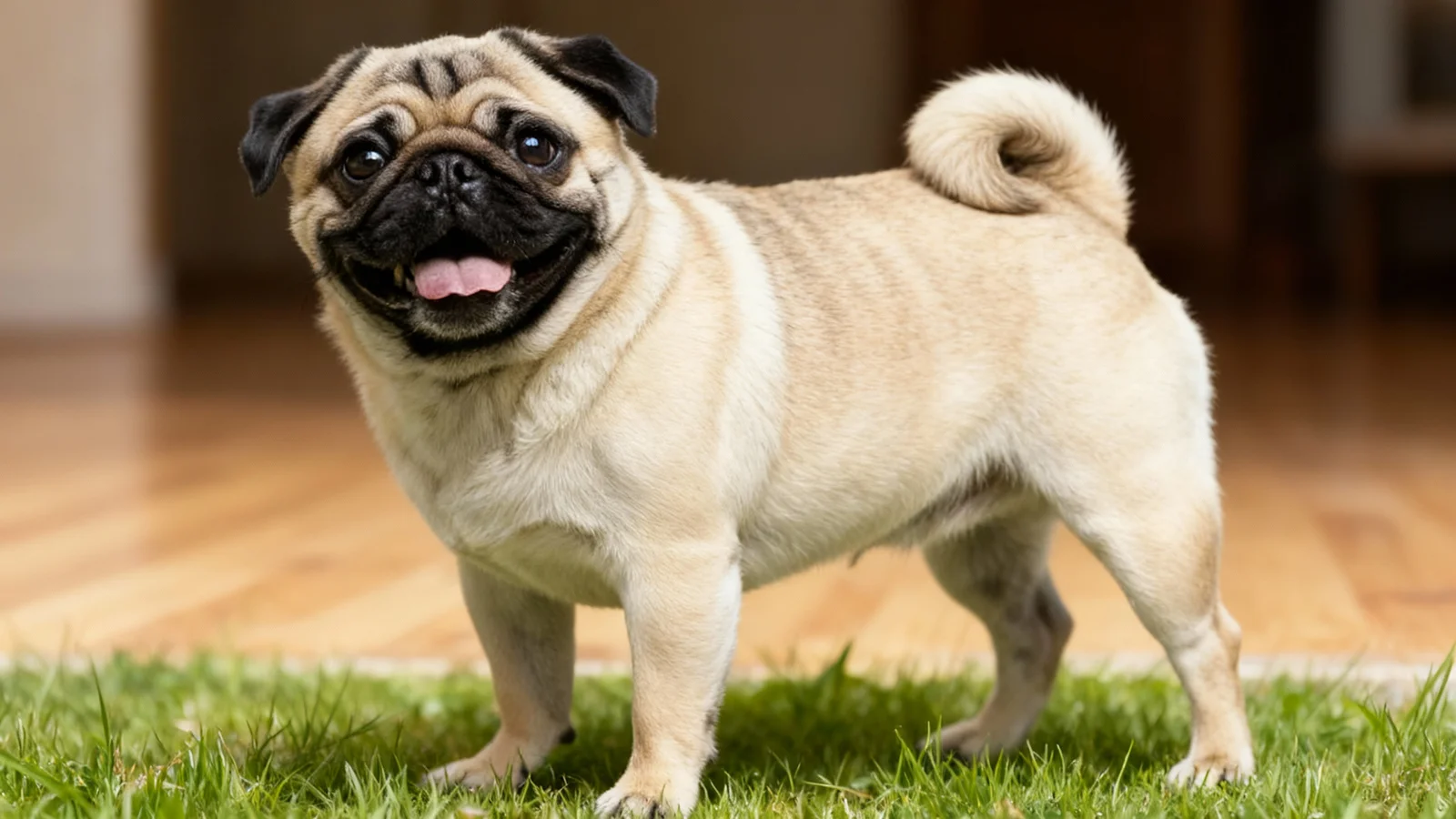 巴哥犬属于小型犬,身体紧凑结实,骨量较足。头部宽而圆,鼻子极短,面部有深浅不一的皱纹,眼睛大而突出,整体表情看起来既滑稽又可爱。耳朵通常为小型下折耳,尾巴高位卷曲,常常紧紧卷在背上。