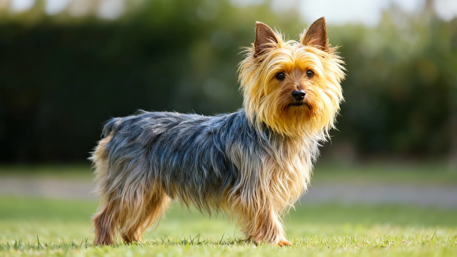 丝毛梗属于小型玩具体型犬,但仍保留了梗犬典型的紧凑体格和结实骨架。头部略呈楔形,眼睛小而有神,耳朵直立,整体表情灵动警觉。最具识别度的特征是那层贴身下垂、质地细腻柔顺、带有光泽感的长被毛,颜色多为蓝灰配棕黄等组合。