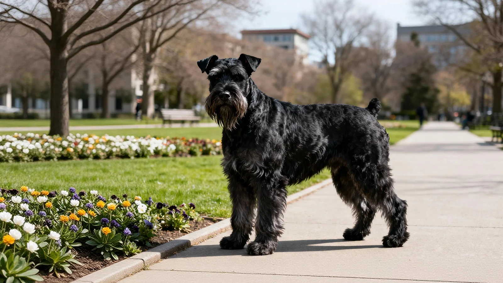 巨型雪纳瑞属于大型、骨骼强壮的工作犬,体型方正结实,肌肉发达,整体给人一种“紧绷着的力量感”。头部长而有力,明显的眉毛和胡须让表情格外鲜明。耳朵通常为自然的折耳或立耳(因地区习惯而异),眼神深邃而警觉。典型毛色包括纯黑色、胡椒盐(pepper & salt)等,双层硬质被毛既能防雨防雪,又能在一定程度上保护皮肤免受轻微划伤。