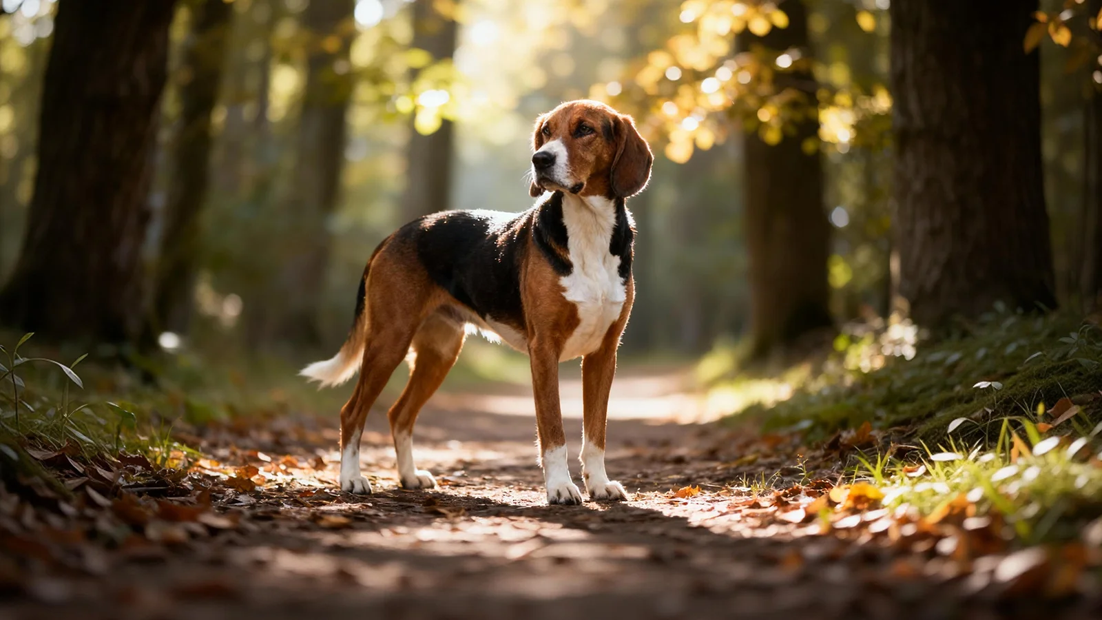 英国猎狐犬属于中大型、体态修长的嗅觉型猎犬,骨骼结实、胸深背平,整体线条偏“运动型”。头部略呈方形,口吻端正,耳朵中等长度、下垂贴脸,眼神多半温和而警觉。躯干比例协调,四肢笔直有力,能在不平坦地面上长时间奔跑。