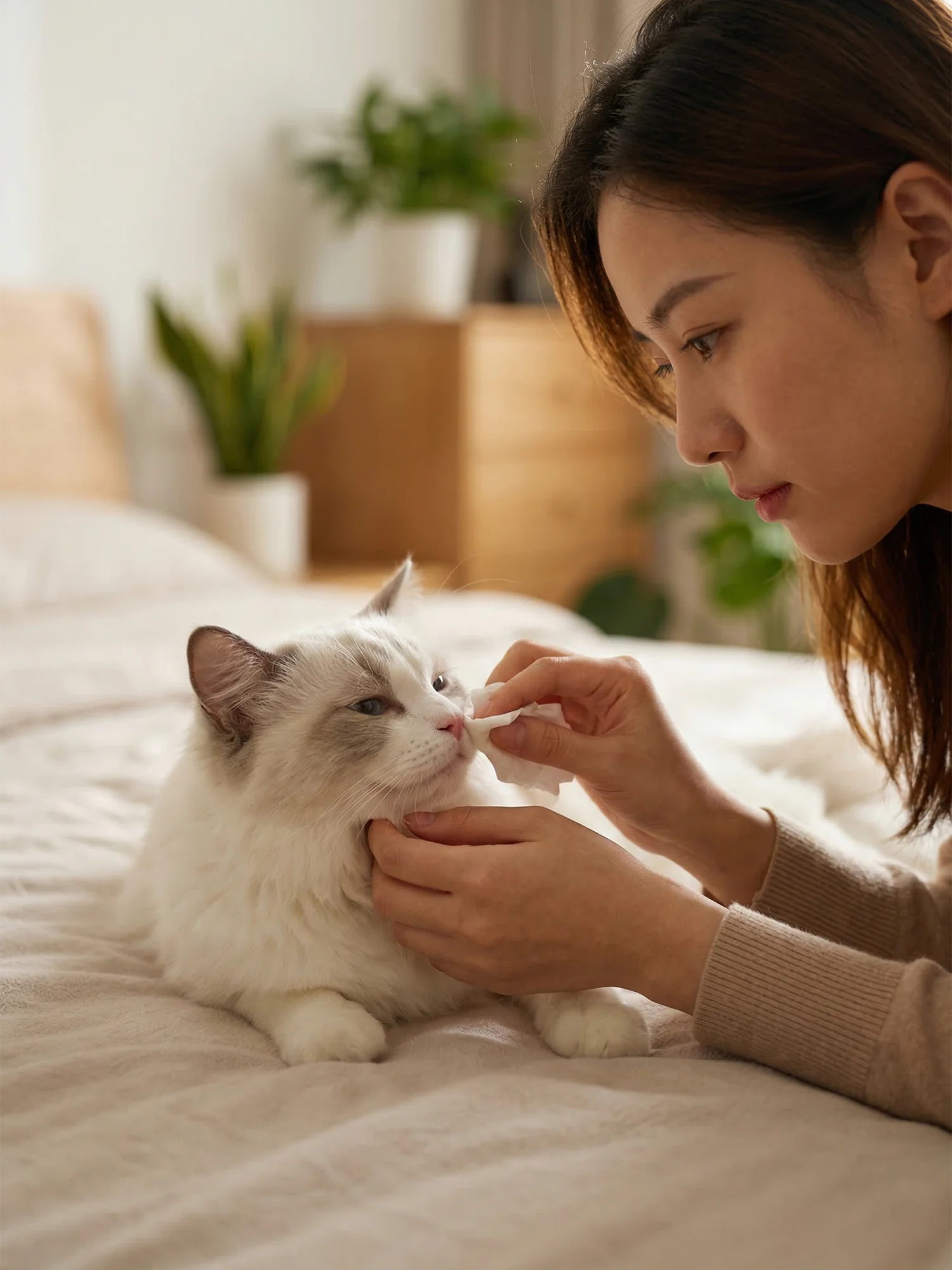 如果鼻口有分泌物,可以用干净柔软的材料轻轻擦掉,避免结块后让猫更难呼吸。动作要轻,不要反复磨鼻头周围。