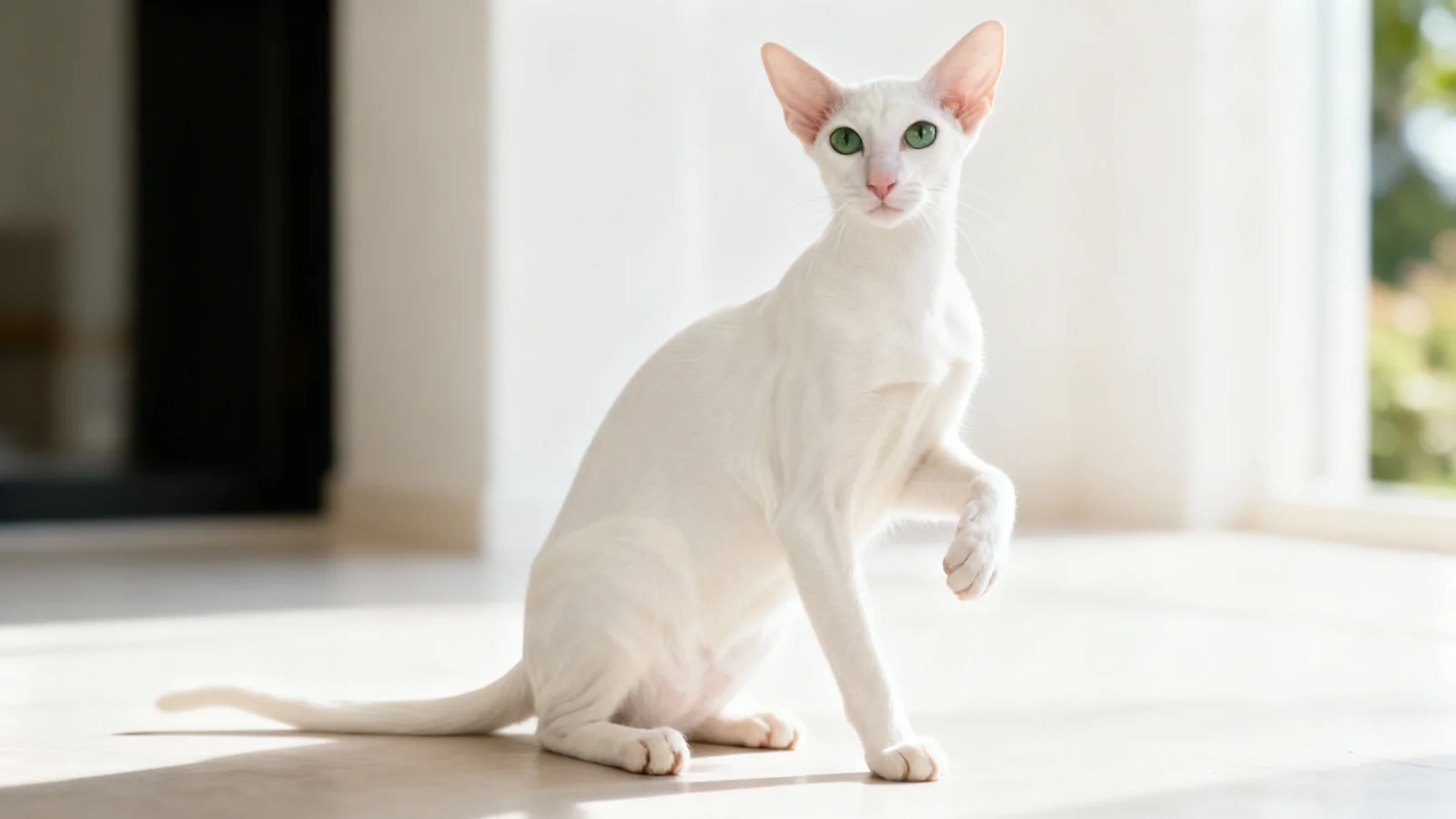 东方短毛猫属于中等体型,但身材十分修长纤细,典型特征是“长直线条”:身体呈细长的管状,四肢又长又直,后肢略高于前肢,尾巴细长如鞭,末端渐尖。头部为长楔形,从鼻尖到耳尖可画出一个流畅的三角形轮廓;耳朵很大、根部宽,像两把“展开的扇子”自然延伸出头部的线条,眼睛呈杏仁形,多为明亮的绿色,整体气质十足“东方感”。