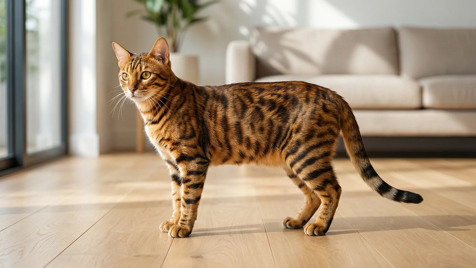 玩具虎猫属于中等体型偏结实的短毛猫,身体修长而肌肉发达,肩部和前胸骨量突出,走路时有一种“低伏前行”的滚动步态,颇有小型猛兽的气场。成年体重大致在 3.5–7 kg 左右,公猫通常更高大、更有力量感。