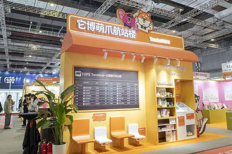 有趣的是,展区用了“航站楼”这一主题:一边是模拟的宠物友好值机柜台和登机通道,另一边是宠物出行推车、旅行配件,还有随处可见的“机长汪”“空乘喵”形象。对参观者来说,这不仅是一个看新品的地方,也是一个可以带着自己的消费想象“起飞”的空间——从日常吃喝,到跨城出行,再到老年宠物的健康管理,都被悄悄塞进了细节里。